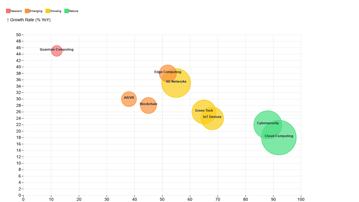 Custom Observable Plot visualization showing technology adoption rates, market sizes, and growth trajectories