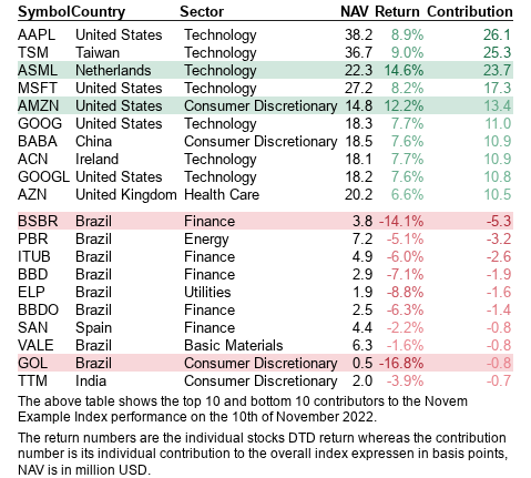 Example table of top 10 and bottom 10 contributors to the novem example index