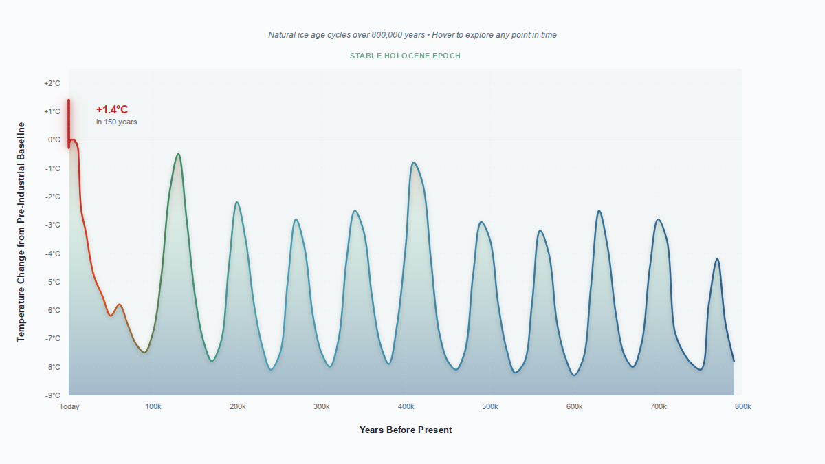 The red spike at the far right breaks this pattern—rising 1.4°C in just 150 years, faster than any natural change in the entire record.